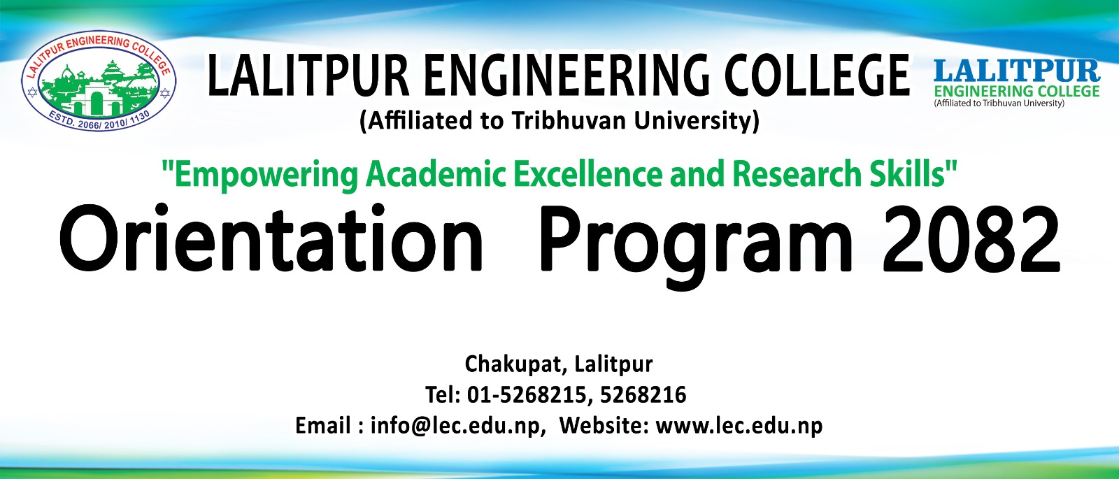 Lalitpur Engineering College will be conducting the Orientation Program for the new 2082 batch of Computer and Civil Engineering students on 2082/08/06 at 10:30 AM. We look forward to welcoming all newly admitted students.